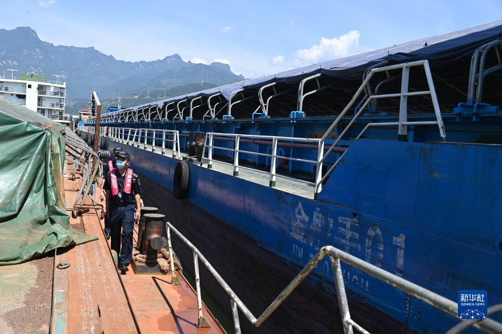 8月9日,三峽海事局的執法人員在待閘船舶上巡檢。 新華社記者 蔡湘鑫 攝