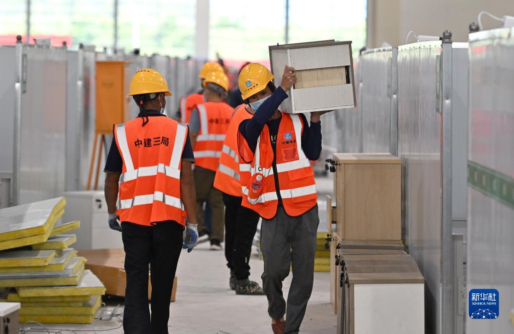 8月10日,工人在三亞第二方艙醫院作業(yè)。