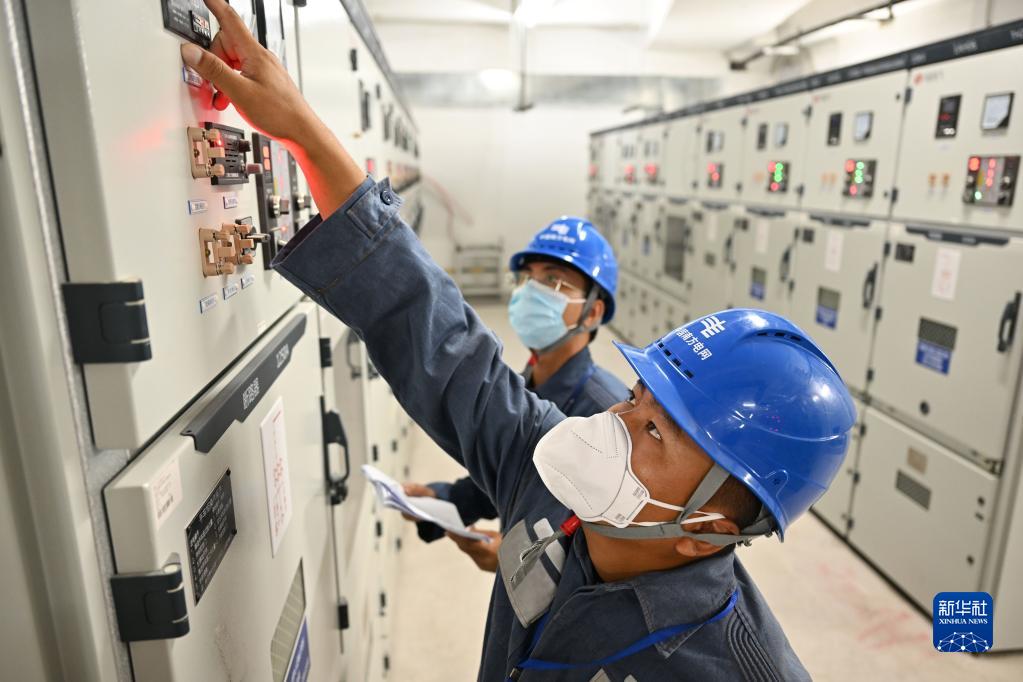 8月10日,三亞供電局工作人員在三亞第二方艙醫院檢查電力設備。
