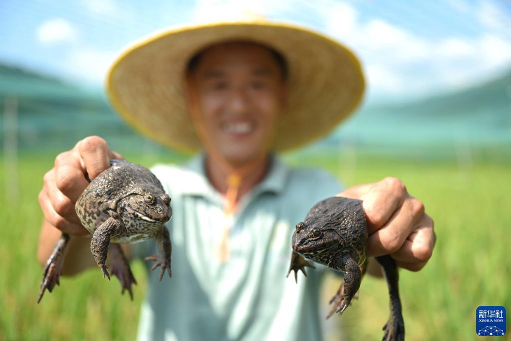 8月9日,村民在建甌市迪口鎮霞莊村稻蛙生態(tài)立體種養示范點(diǎn)展示生態(tài)稻田蛙。