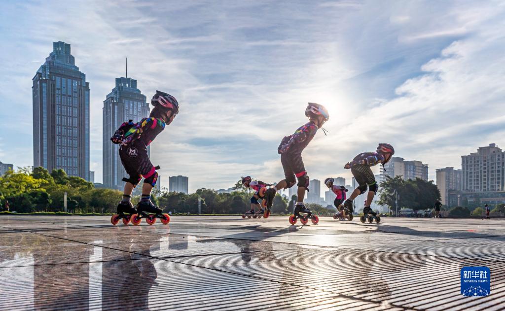 8月10日,小朋友在重慶市南川區市民廣場(chǎng)練習輪滑。