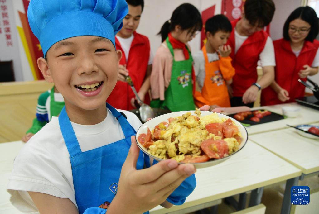 8月10日,在江蘇省鎮江市紅光太古山社區,一名小朋友展示江蘇大學(xué)志愿者指導他烹制的家常菜。