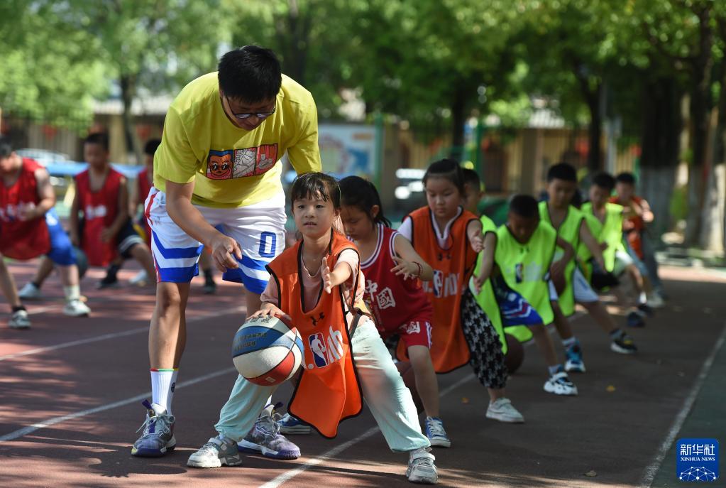 8月11日,在合肥市蜀新苑小學(xué)暑期托管班里,學(xué)生在老師指導下學(xué)習籃球。