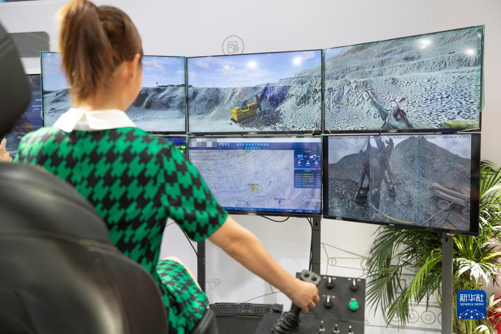 8月11日,在2022世界5G大會(huì )展廳里,參觀(guān)者體驗5G網(wǎng)絡(luò )支持下的遠程挖礦設備。