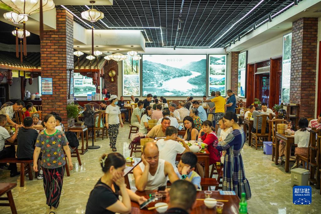 游客在仁懷市茅臺鎮“茅臺鎮記憶”餐館內就餐(8月4日攝)。