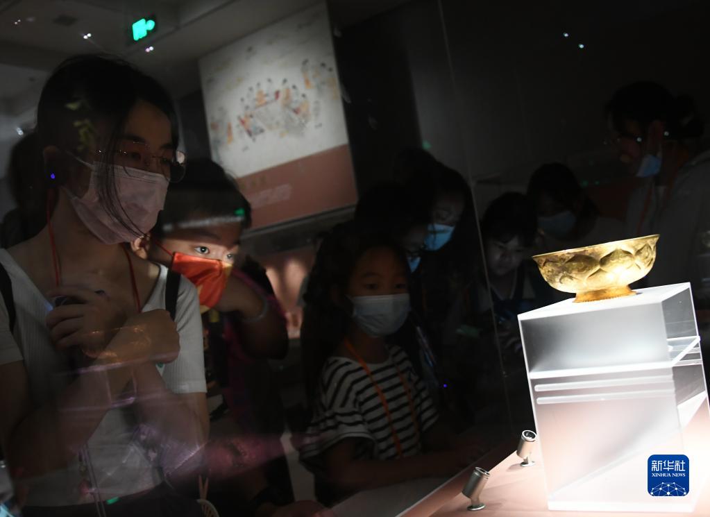 8月11日,游客在陜西歷史博物館何家村窖藏出土文物展上參觀(guān)鴛鴦蓮瓣紋金碗。