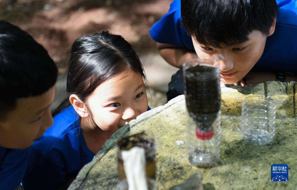 8月10日,在陜西漢中黎坪國家森林公園,研學(xué)團隊的小朋友在觀(guān)察過(guò)濾凈水法。