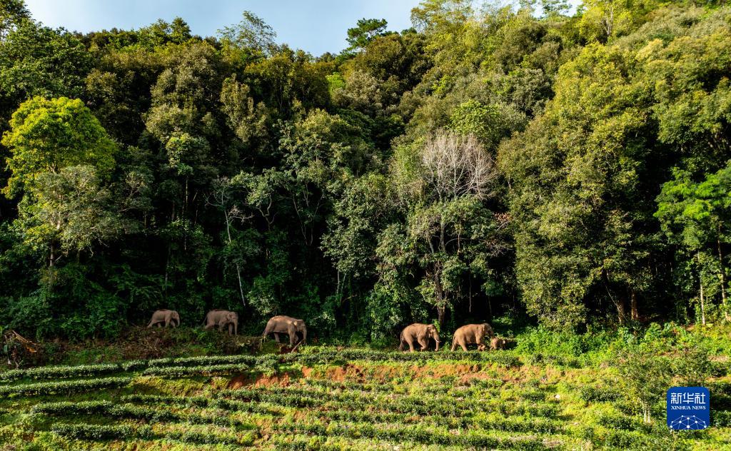 象群途經(jīng)云南省普洱市江城哈尼族彝族自治縣一村莊(無(wú)人機照片,8月1日攝)。新華社記者 江文耀 攝