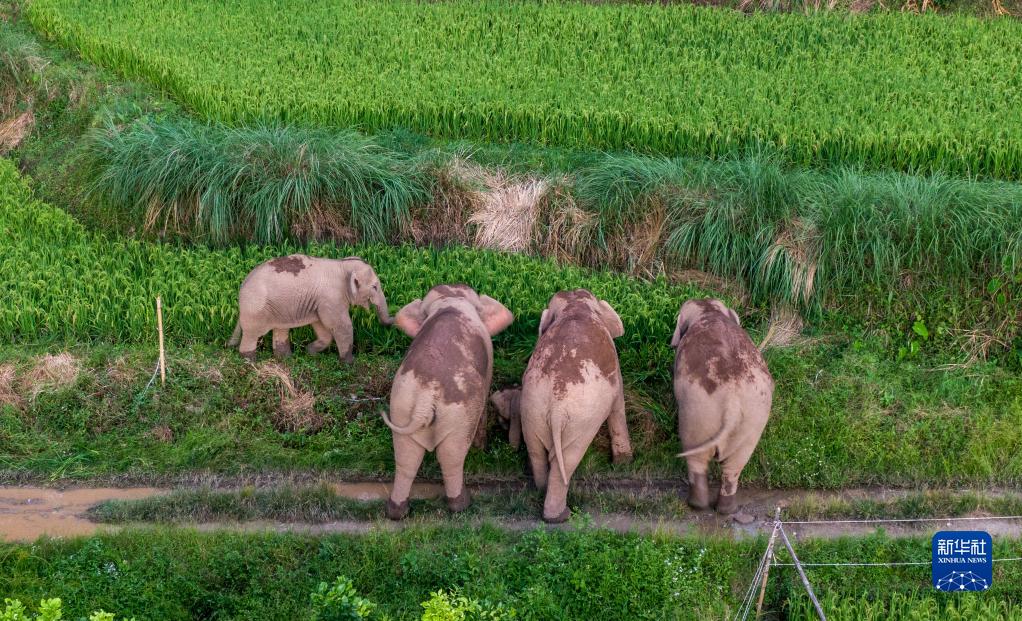 象群在云南省普洱市江城哈尼族彝族自治縣覓食(無(wú)人機照片,8月1日攝)。新華社記者 江文耀 攝