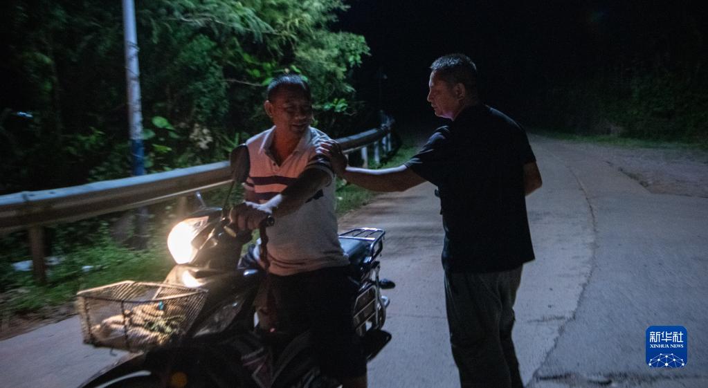 刁發(fā)興(右)提醒夜間出行的村民注意安全(7月31日攝)。新華社記者 江文耀 攝