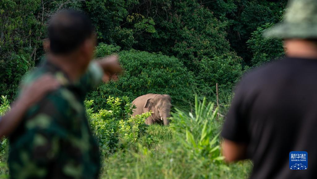 刁發(fā)興(右)在觀(guān)察村莊附近的野象(8月1日攝)。新華社記者 江文耀 攝