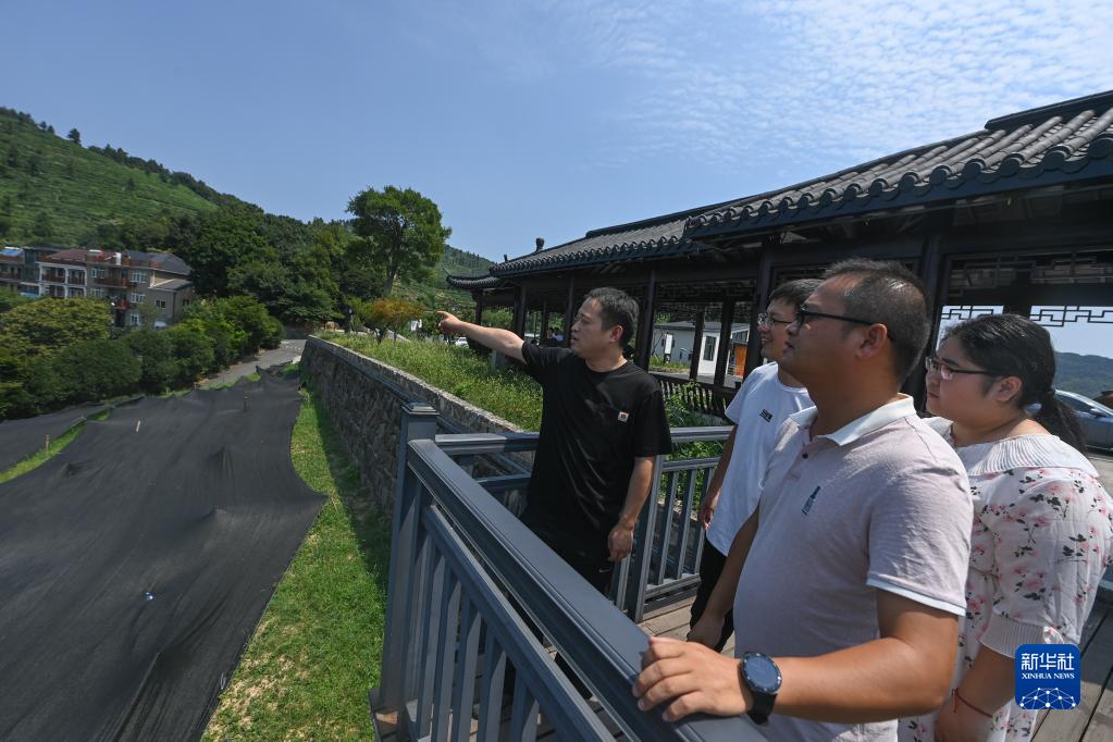 8月12日,回歸新鄉賢夏敏鋼(左一)給來(lái)安頂村旅游的游客介紹鄉村特色景點(diǎn)。