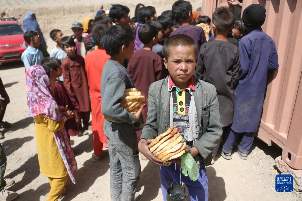 7月13日,阿富汗巴米揚兒童參加文物保護知識培訓后領(lǐng)到食物。