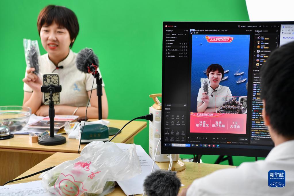 主播在福建省霞浦縣“趕海父子”直播間介紹當地盛產(chǎn)的海參(8月10日攝)。