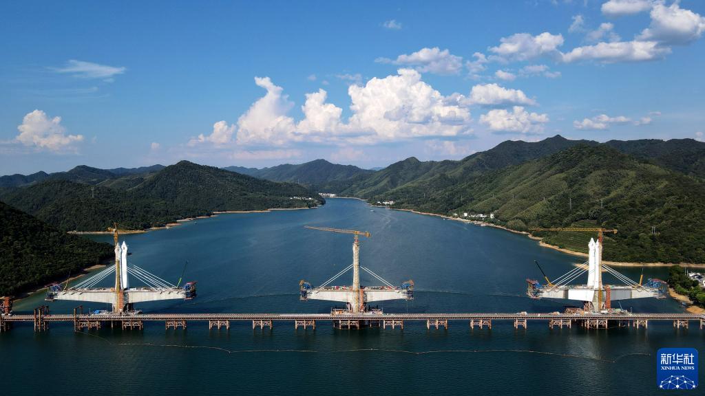 這是正在建設中的中國鐵建大橋局池黃鐵路太平湖特大橋(8月12日攝,無(wú)人機照片)。