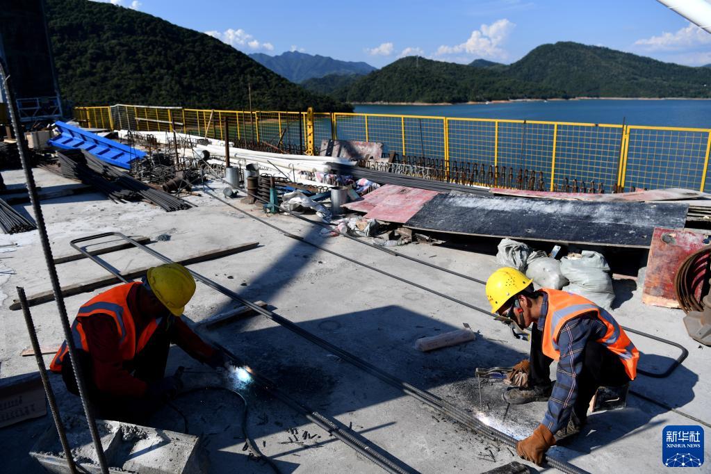 8月12日,工人在中國鐵建大橋局池黃鐵路太平湖特大橋建設工地施工。