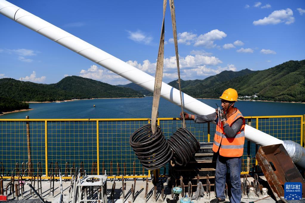 8月12日,工人在中國鐵建大橋局池黃鐵路太平湖特大橋建設工地施工。