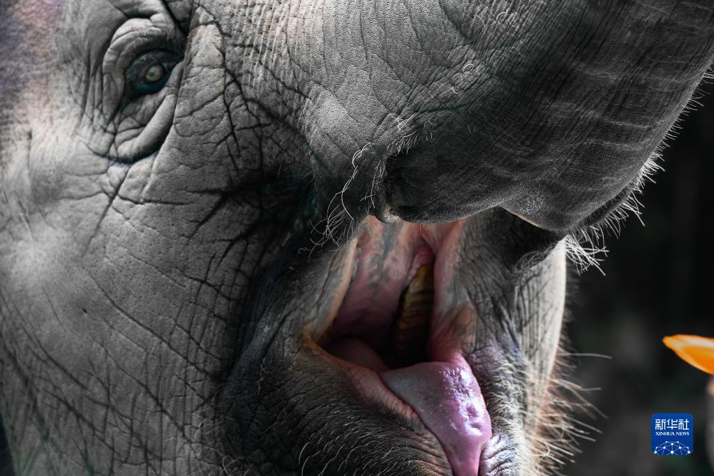 8月12日,廣州長(cháng)隆野生動(dòng)物飼養員引導亞洲象張開(kāi)嘴巴,以便檢查它的臼齒健康狀況。新華社記者 劉大偉 攝