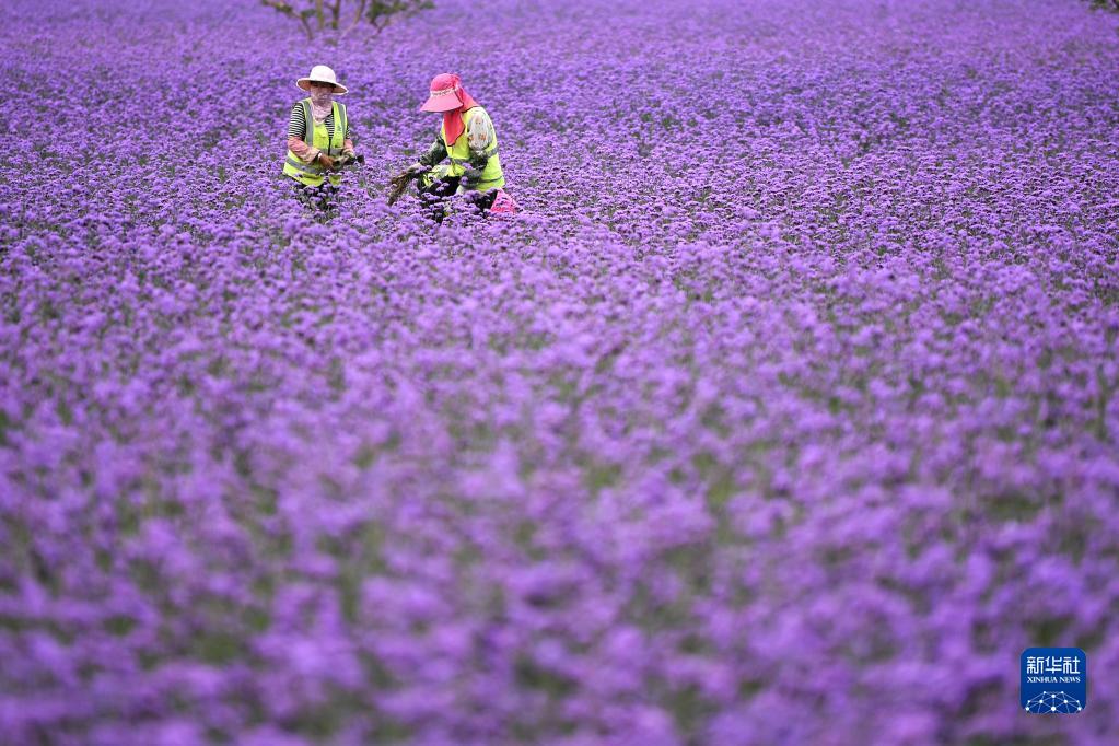兩名工人在蘭州新區臨港花海除草(8月10日攝)。