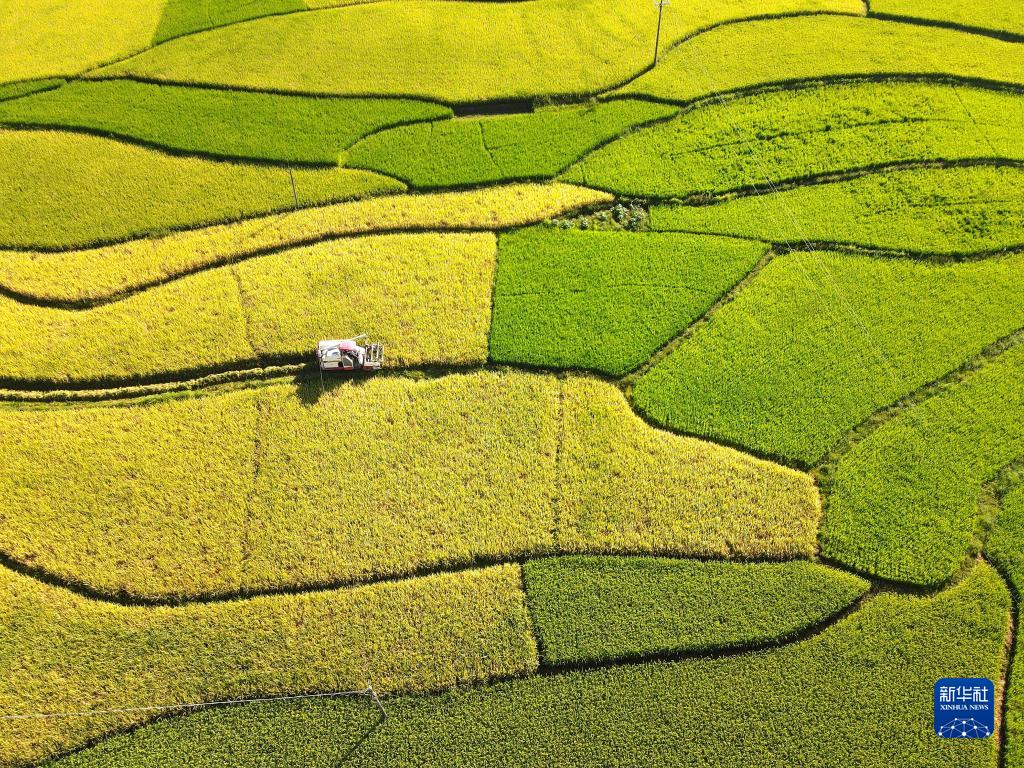 8月12日,在湖南省雙峰縣井字鎮銅梁村,農民駕駛收割機收割再生稻(無(wú)人機照片)。
