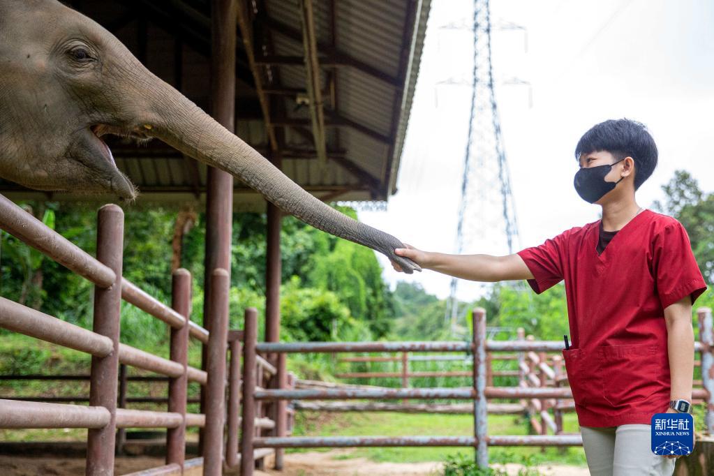 8月6日,在泰國南邦府“亞洲象之友”大象醫院,獸醫安慰一頭受傷的大象。