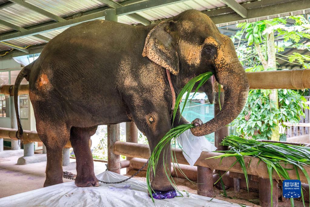 8月6日,在泰國南邦府“亞洲象之友”大象醫院,一頭受傷的大象在進(jìn)食。