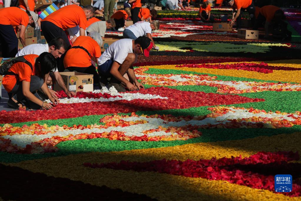 8月12日,工作人員在比利時(shí)布魯塞爾大廣場(chǎng)鋪裝“鮮花地毯”。