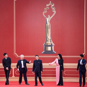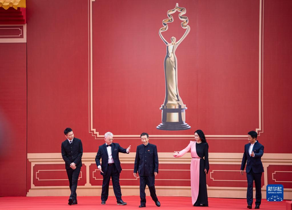 8月12日,本屆“天壇獎”國際評委會(huì )成員李雪?。ㄖ校?、郭帆(左一)、柯文思(左二)、秦海璐(右二)、吳京亮相開(kāi)幕紅毯儀式。