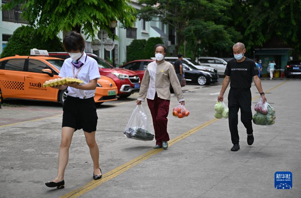 8月13日,三亞市一個(gè)小區的物業(yè)工作人員(左一、左二)幫居民將生活物資送往家中。