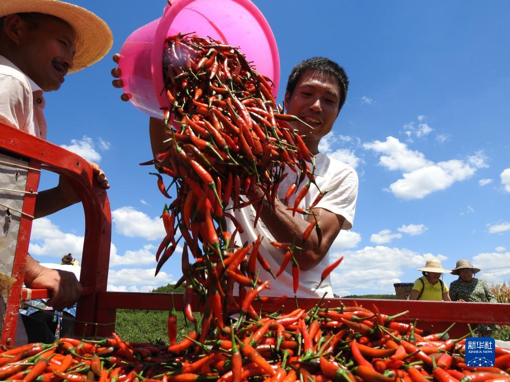 8月12日,四川省達州市大竹縣八渡鄉花巖村村民在收獲辣椒。