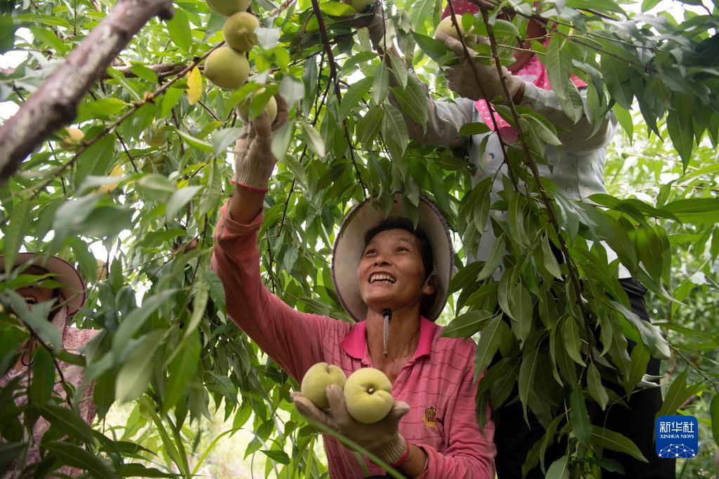 8月13日,湖南省永州市江華瑤族自治縣大路鋪鎮鄧家灣村,果農在采摘青桃。