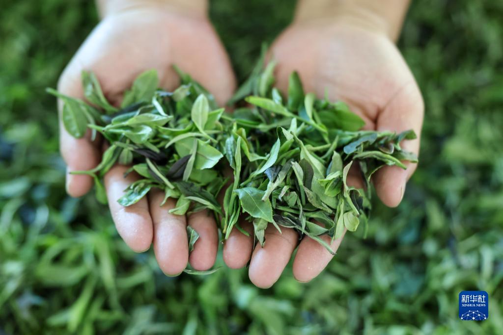 8月9日,工作人員在石阡縣楓香鄉梨子園村茶葉加工廠(chǎng)內檢查茶青。