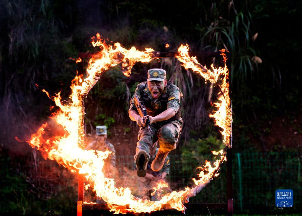火箭軍某旅發(fā)射一營(yíng)班長(cháng)、一級軍士長(cháng)何賢達在獵人意志訓練中穿越火障(2022年6月26日攝)。