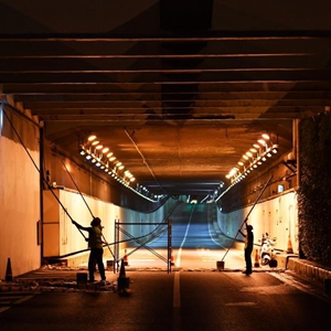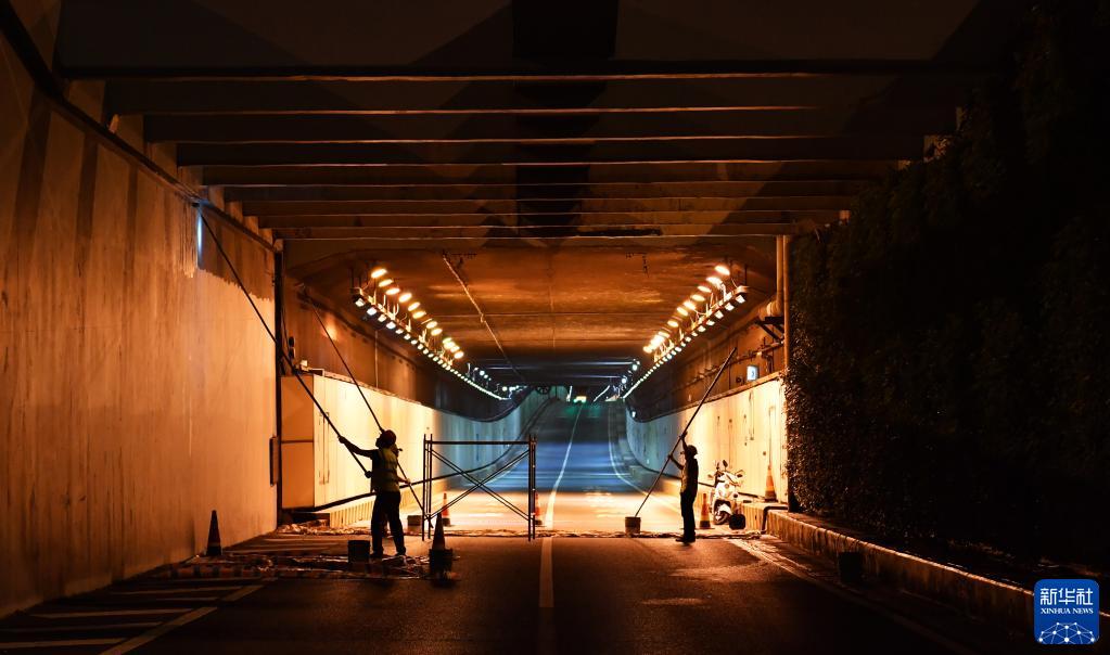 位于湖南省長(cháng)沙市的營(yíng)盤(pán)路隧道是橫穿湘江的第一條隧道,也是連接湘江兩岸的過(guò)江主干道。檢修工人利用每周末0時(shí)至6時(shí)的“空窗期”,對總長(cháng)達8.5公里的隧道進(jìn)行線(xiàn)路檢修、坑洞修補等養護作業(yè),保障市民順暢出行。