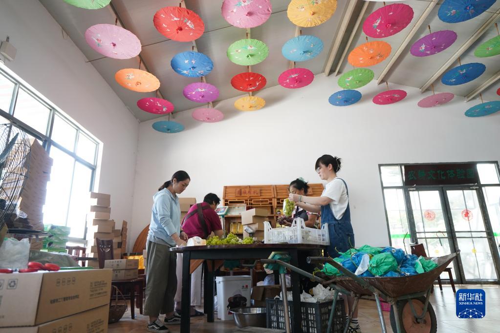 8月13日,王娟(前左)和家人在合作社包裝葡萄。