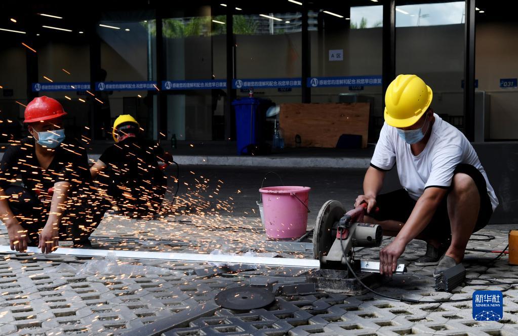 8月14日,工人在三亞第三方艙醫院作業(yè)。
