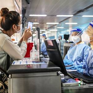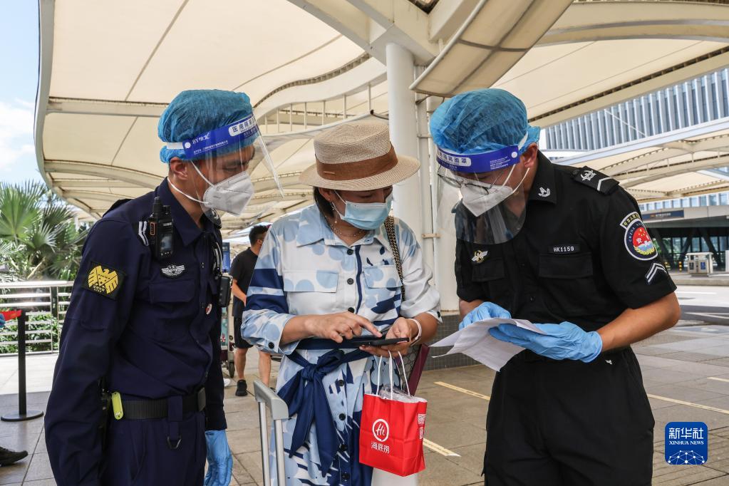 8月14日,??诿捞m機場(chǎng)的工作人員查驗旅客的核酸信息。