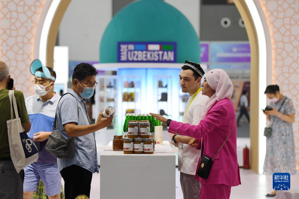 8月14日,參觀(guān)者在第六屆絲綢之路國際博覽會(huì )主賓國烏茲別克斯坦展區上了解當地特色商品。