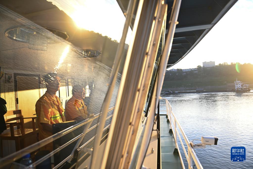 從后半夜四點(diǎn)開(kāi)始值班駕駛的二副李行(左)和船長(cháng)劉勇在民快輪駕駛艙迎來(lái)清晨的陽(yáng)光(8月8日攝)。