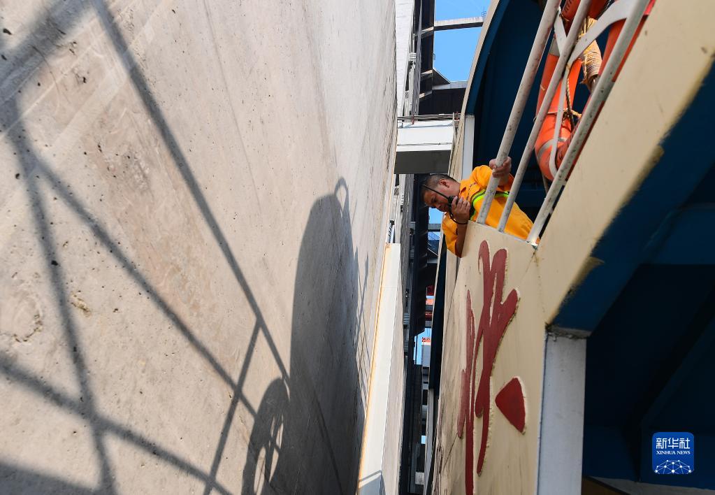 民快輪通過(guò)葛洲壩船閘時(shí),船長(cháng)劉勇在船舷處通過(guò)對講機指揮駕駛室舵工操作。滿(mǎn)載貨物3000噸的民快輪進(jìn)入閘室后,兩側距離閘箱均不足1米,對指揮和駕駛提出極高的要求(8月10日攝)。