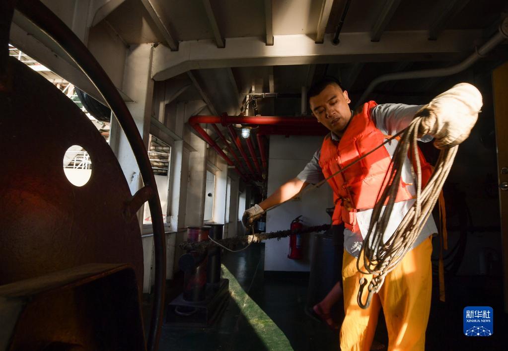 離泊后,二副汪官銀將收回的纜繩整理歸位,便于下一次靠離泊作業(yè)使用(8月9日攝)。