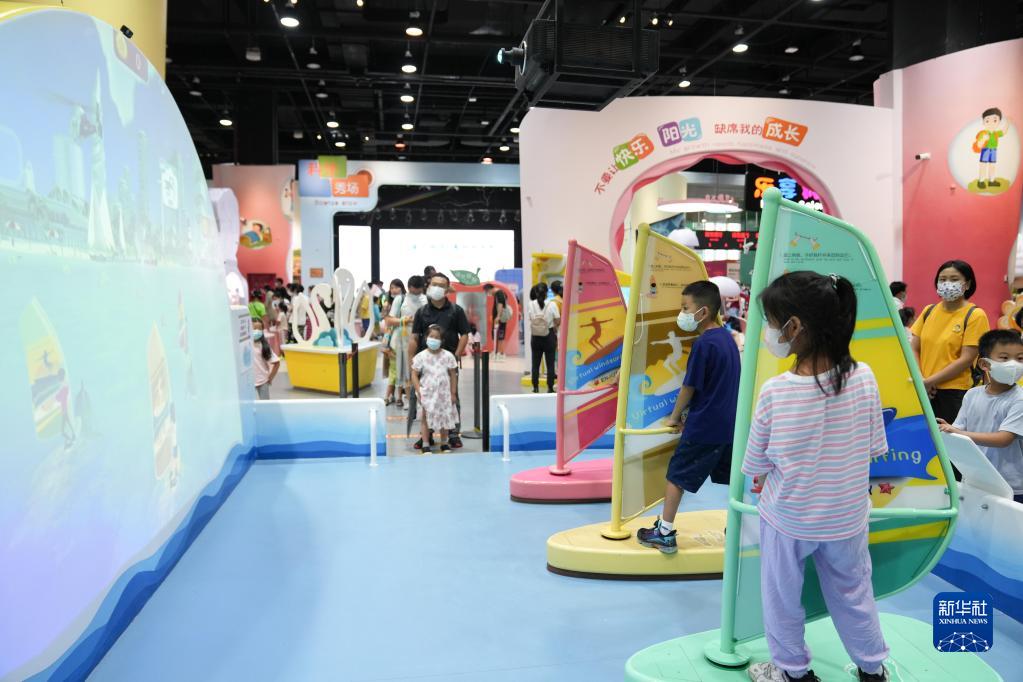 8月14日,在中國科學(xué)技術(shù)館,小朋友在體驗“虛擬帆板”裝置。
