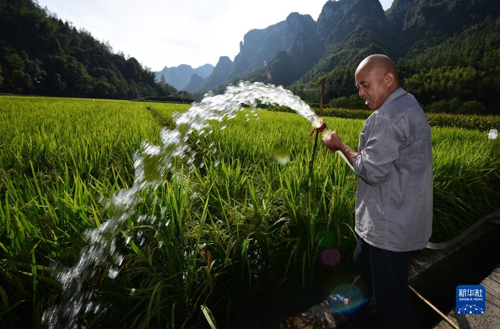 8月14日,湖南省湘西土家族苗族自治州吉首市矮寨鎮大興社區農民在抽水灌田。