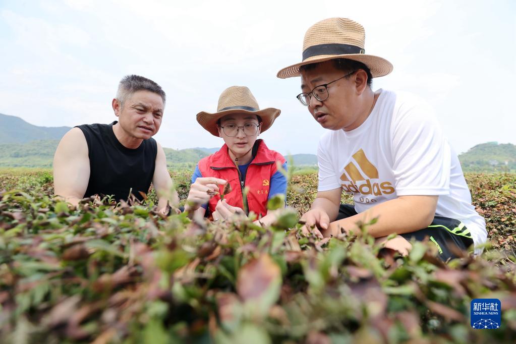8月14日,在浙江省湖州市德清縣莫干山鎮勞嶺村生態(tài)茶園,農技人員指導茶農抗旱。