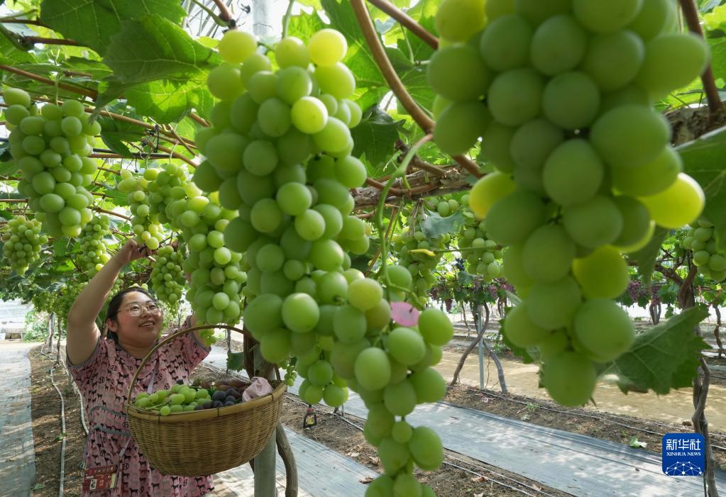 8月15日,盧龍縣蛤泊鎮鮑子溝村秦皇島綠佳家庭農場(chǎng)主邢艷麗在大棚內采摘葡萄。