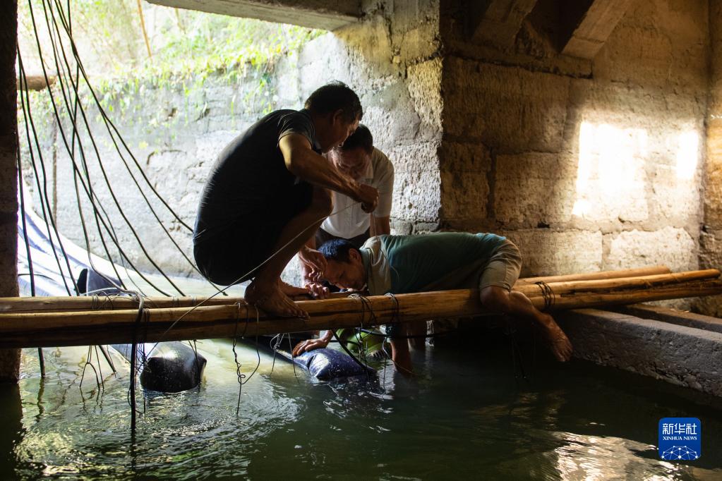 8月15日,在桃源縣熱市鎮郭家埡村,鄉鎮水利站工作人員在取水點(diǎn)安裝抽水設備。