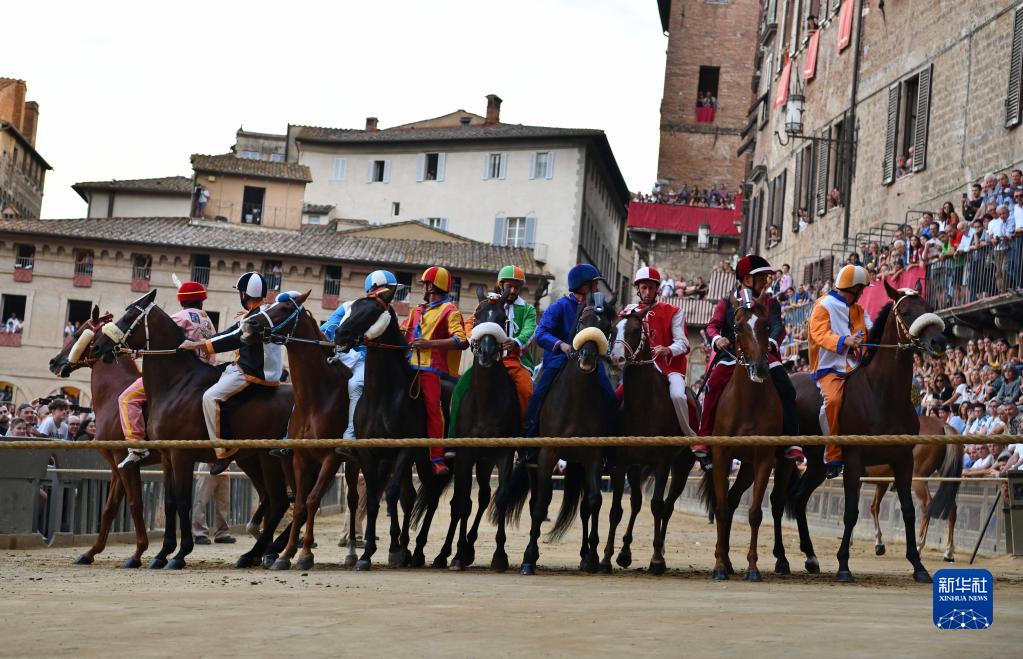 8月15日,騎手在意大利錫耶納田野廣場(chǎng)上參加賽馬節熱身賽。