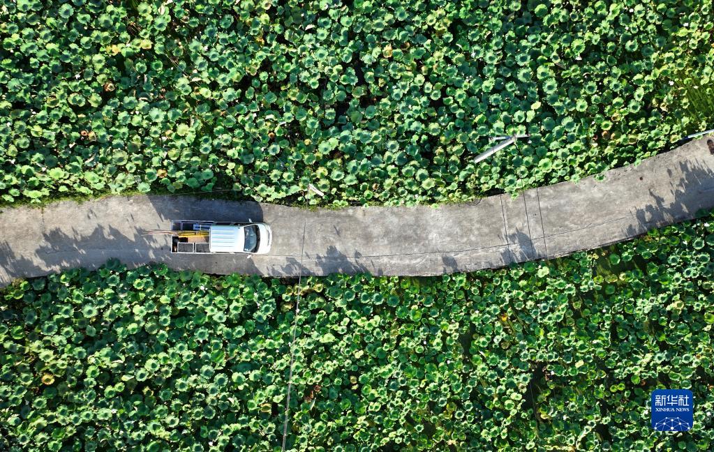 在江西省廣昌縣塘坊鎮淇田村,木偶劇團的貨車(chē)在蓮塘間穿行,前往大株村演出(8月10日攝,無(wú)人機照片)。