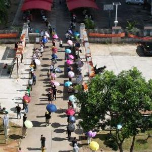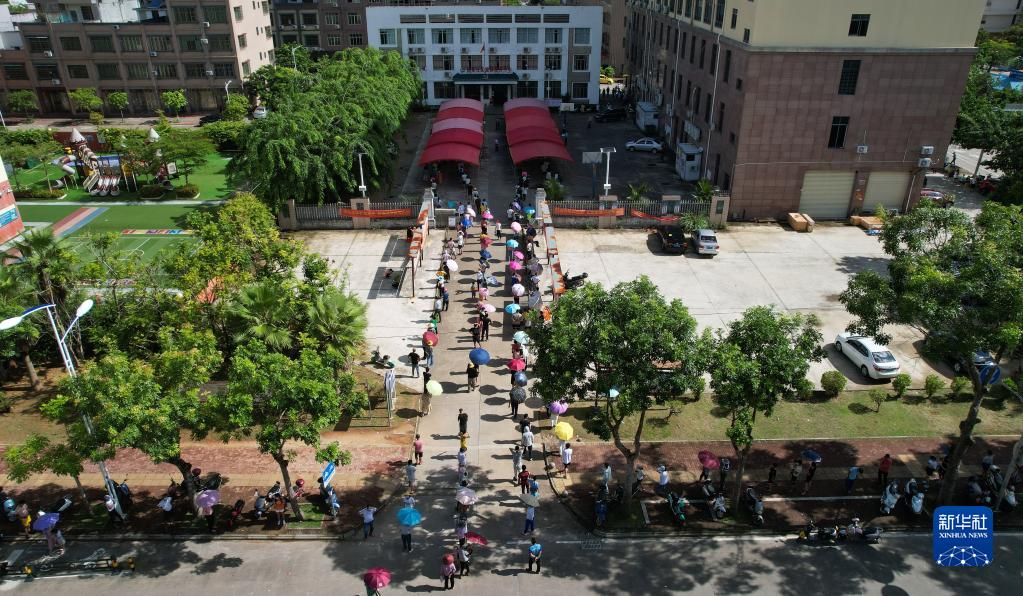 在萬(wàn)寧市萬(wàn)城鎮長(cháng)星社區一處核酸采樣點(diǎn),居民排隊接受核酸采樣(8月13日攝,無(wú)人機照片)。