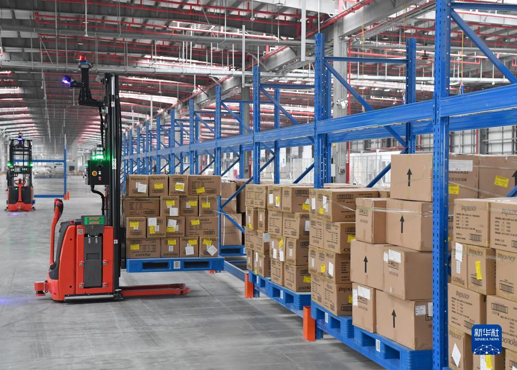 8月16日,在鄭州機場(chǎng)北貨運區倉庫,自動(dòng)化導引叉車(chē)在作業(yè)中。